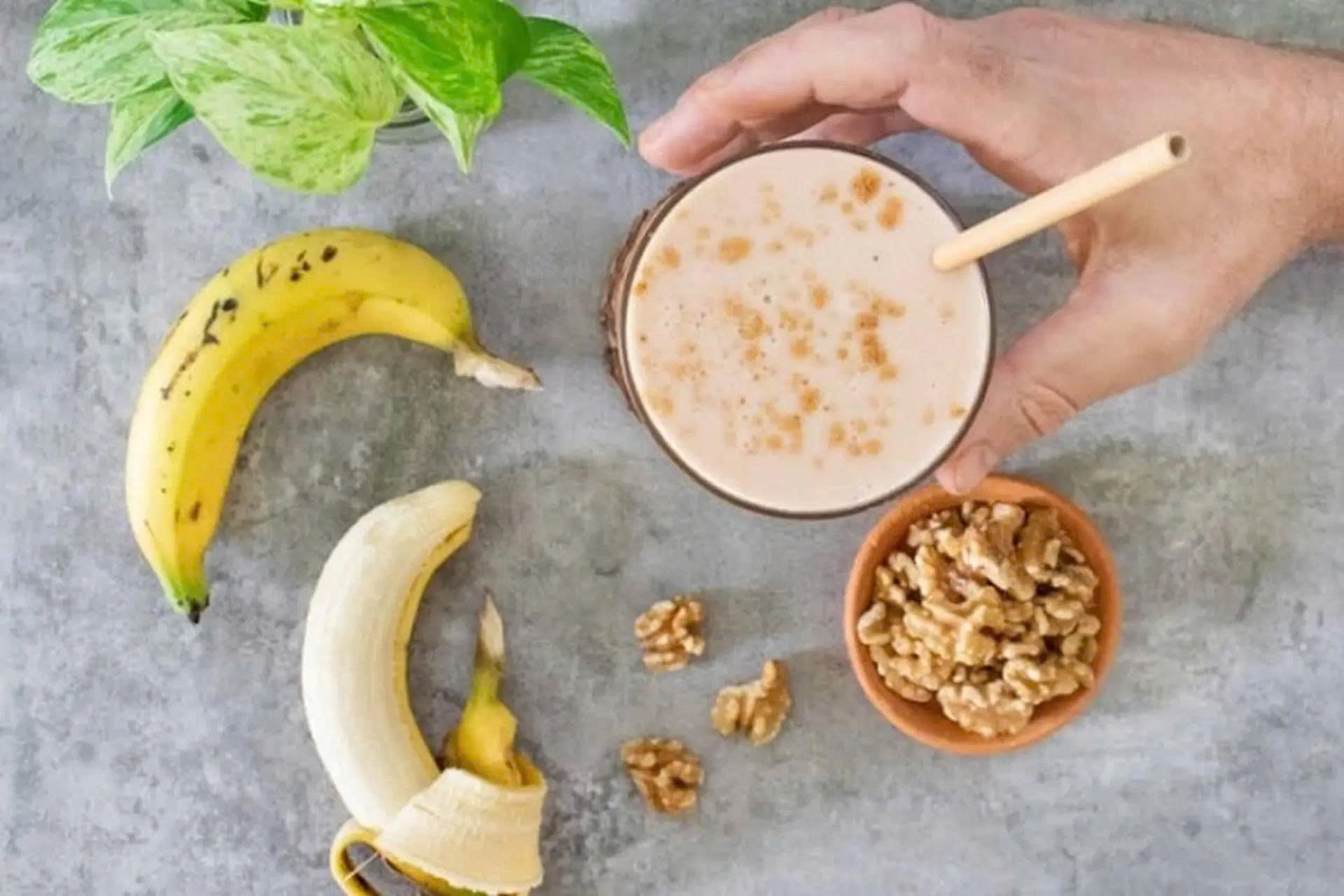 Nguyên liệu: 1 hộp sữa chua không đường, 3–5 hạt óc chó, ½ quả chuối cắt lát