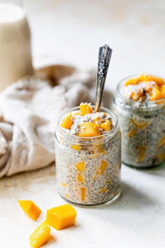 Nguyên liệu: 1 hộp sữa chua không đường, 1 thìa hạt chia ngâm 10 phút, ½ quả xoài chín cắt hạt lựu