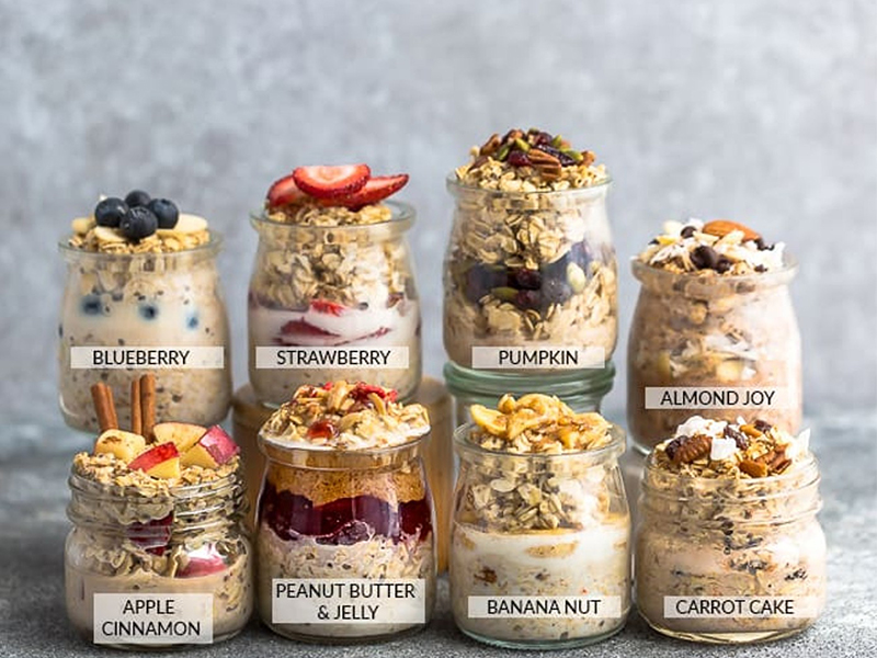 Ngâm yến mạch, sữa hạt, hạt chia và hạt lanh qua đêm. Buổi sáng thêm hạt óc chó, nho khô, dâu sấy. Đây là bữa sáng tiện lợi, giúp bạn hấp thụ đầy đủ chất xơ, vitamin và collagen thực vật.