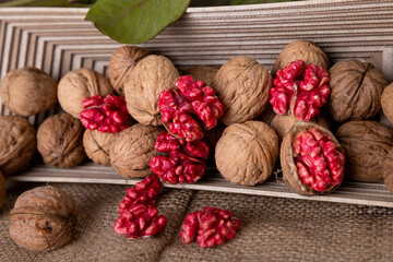 - Màu sắc: Như tên gọi, hạt óc chó đỏ có vỏ ngoài màu đỏ hoặc tím nhạt, nhưng khi bóc vỏ, nhân bên trong vẫn có màu trắng như các loại hạt óc chó thông thường.