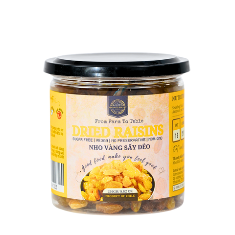 - Xuất xứ: Nhập khẩu từ các quốc gia nổi tiếng về nho khô (Ví dụ: Mỹ, Chile, Iran…)